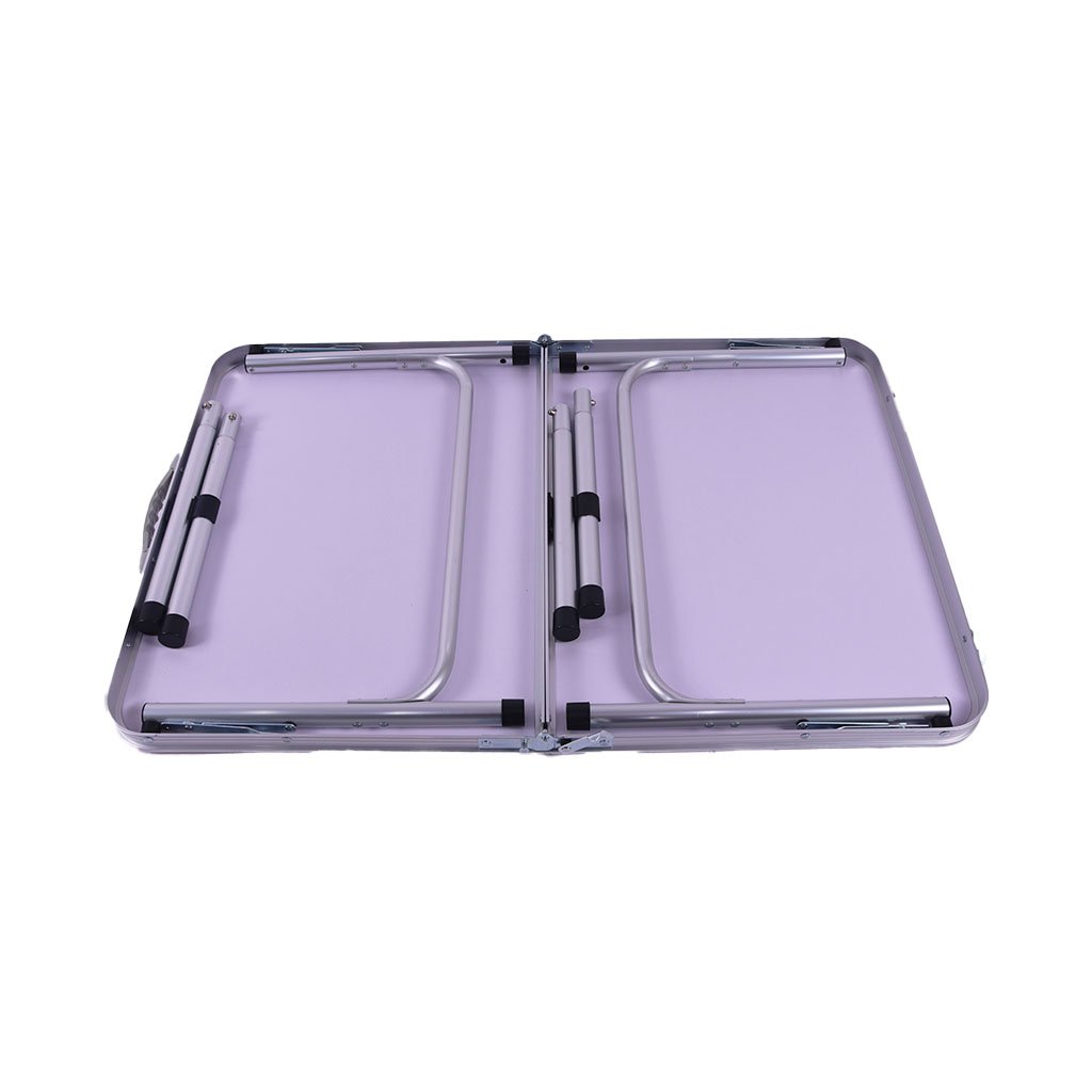 الطاولة مصممة من مواد متينة وخفيفة الوزن تضمن ثباتها وسهولة الحمل، مع تصميم أبيض أنيق.